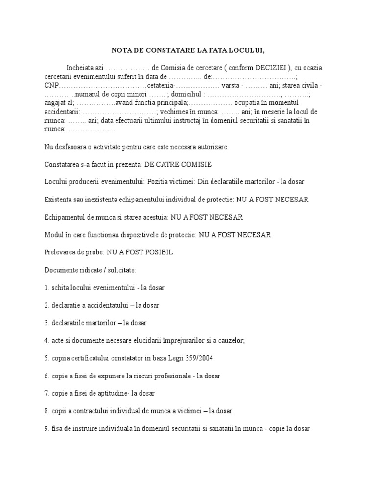1.425/ 2006 nota de constatare la fata locului, incheiat ă azi … de …, cu ocazia 25.11.2011 · un posibil model de nota de constare si evaluare a pagubei produse de salariat: De., cu ocazia cercet rii evenimentului suferit n data de. 118 cod de procedur penal a efectuat cercetarea la faa locului despre care fapt, n conformitate cu prevederile art.